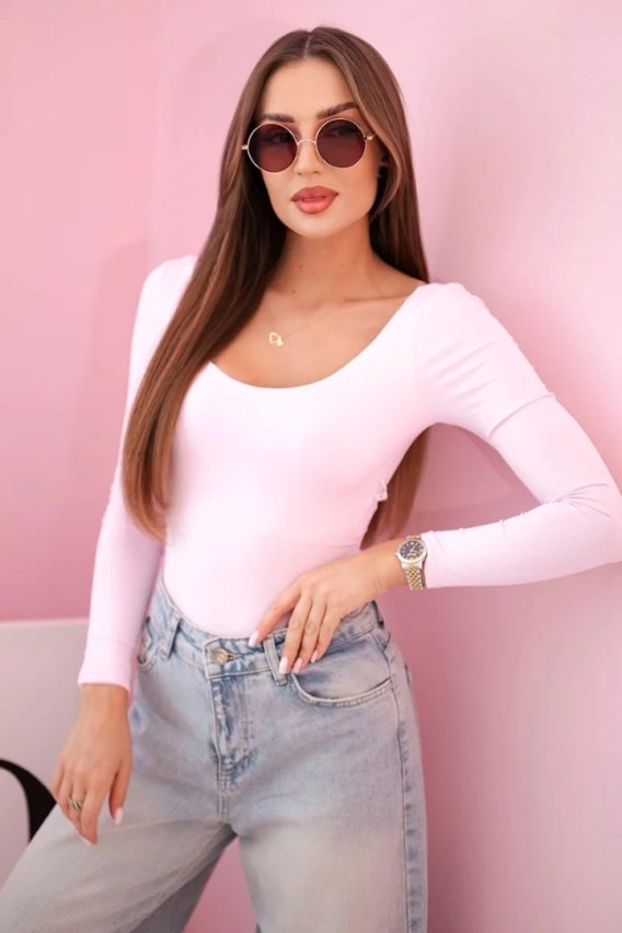 Bluzka body damska z długim rękawem i głębokim dekoltem cukierkowy róż
