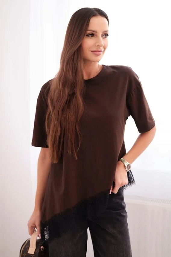 Bluzka damska bawełniana asymetryczna z koronką na dole brązowa