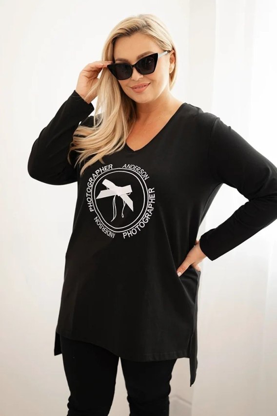 Bluzka damska z dłuższym tyłem i nadrukiem czarna