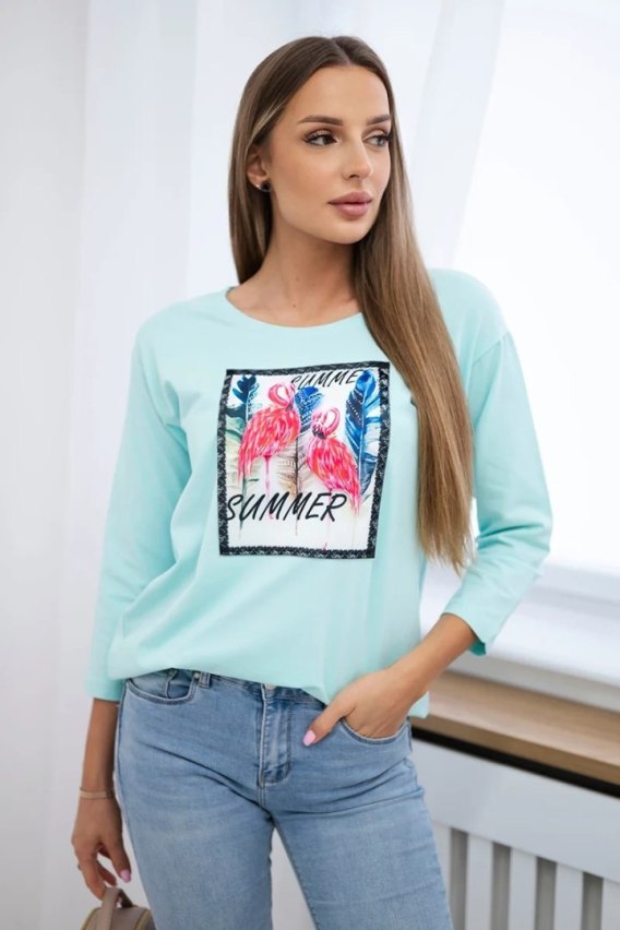 Bluzka z grafiką flamingów 3D miętowa