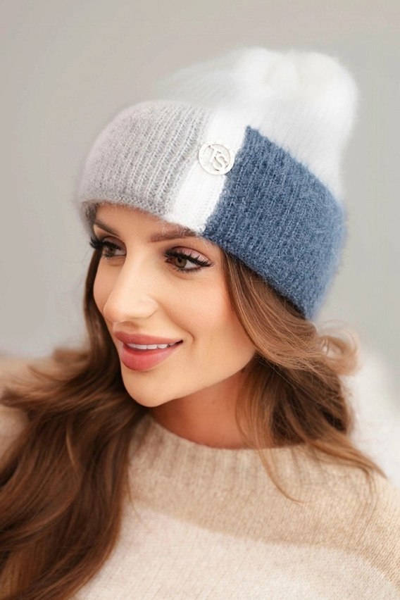 Czapka damska kolorowa z wiskozy z ozdobnym guzikiem biały + granatowy