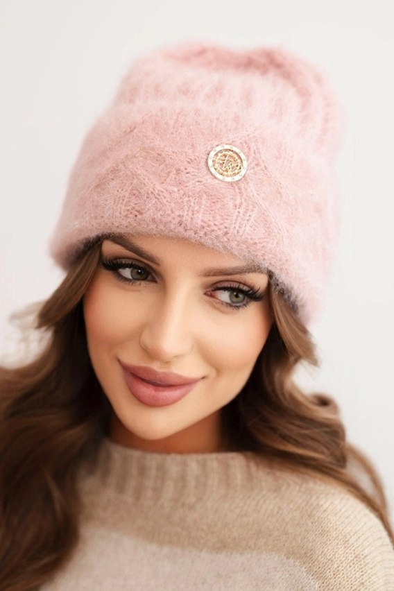 Czapka damska prążkowana z wiskozy puszysta z ozdobnym metalowym guzikiem pudrowy róż