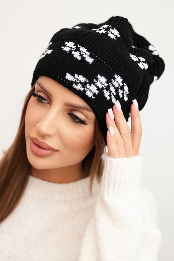 Czapka damska zimowa dzianinowa z wzorem śnieżynek K463 czarna