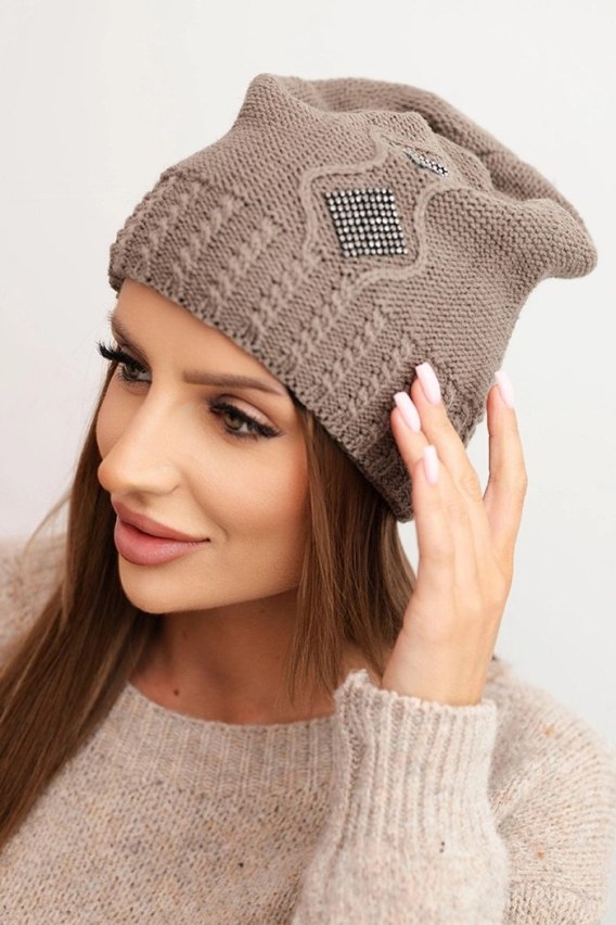 Czapka damska zimowa wełniana z cyrkoniami i wzorem K455 cappuccino