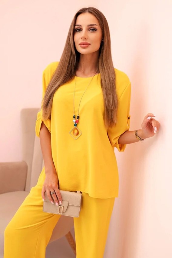 • Komplet damska z bluzką z naszyjnikiem i szerokimi spodniami żółty