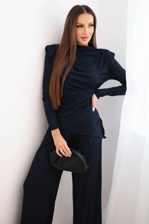 Komplet damski bawełniany z bluzką i spodniami z szeroką nogawką granatowy