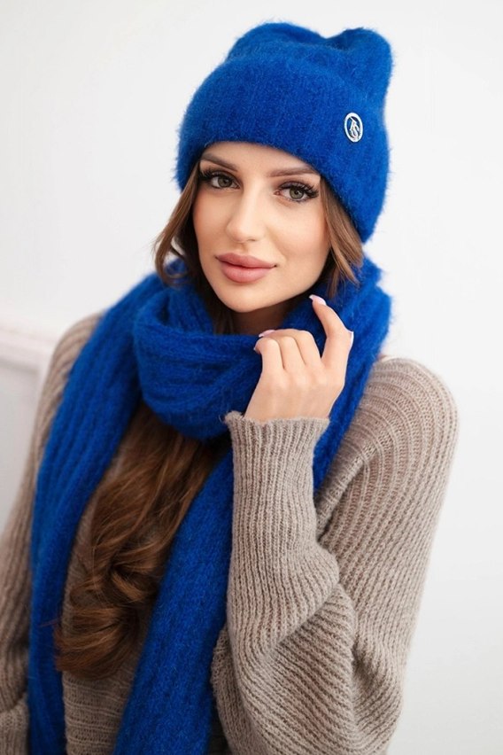 Komplet damski czapka i długi szalik z miękkiej przędzy chabrowy