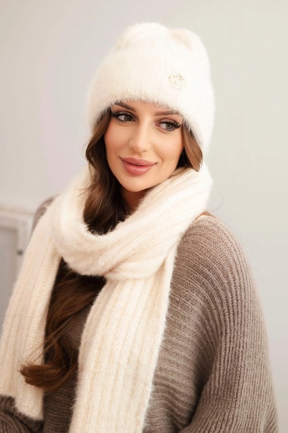 Komplet damski czapka i długi szalik z miękkiej przędzy ecru