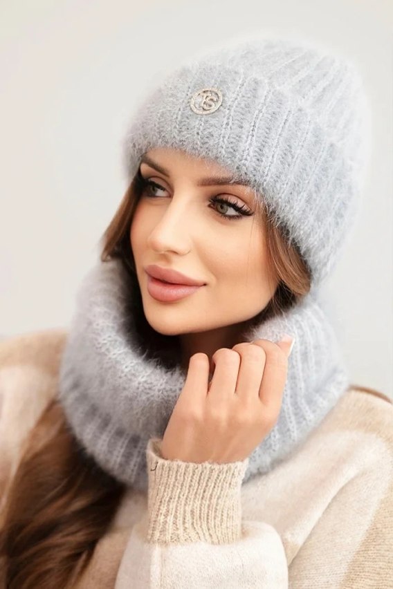 Czapka posiada ozdobny emblemat z metalicznym wykończeniem, który nadaje całości modnego i eleganckiego wyglądu. Komin łatwy do założenia przez głowę, otulający szyję bez potrzeby wiązania.