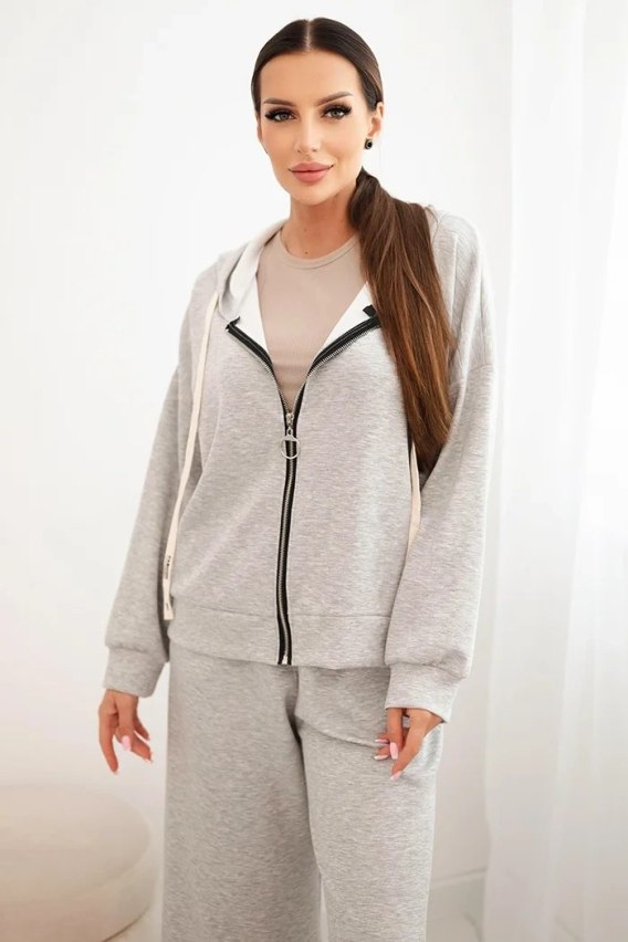 Komplet damski masełko z szeroką nogawką i bluzą na zamek szary