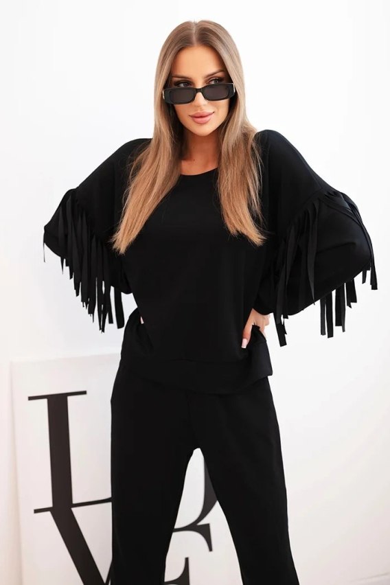 Komplet damski masełkowy z frędzlami na rękawach czarny