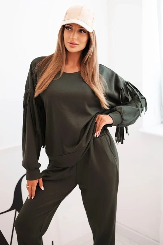 Komplet damski masełkowy z frędzlami na rękawach khaki