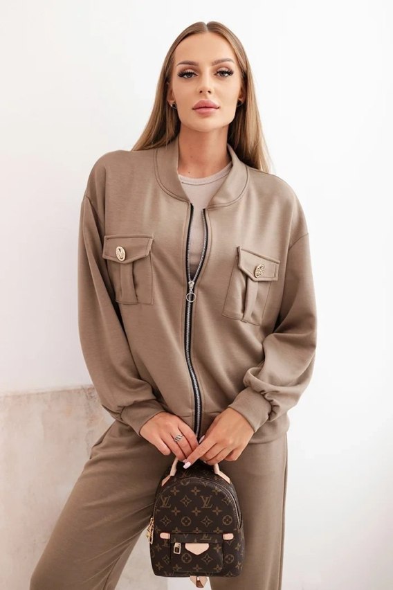 Elegancki i wygodny komplet damski w masełkowym wydaniu, stworzony z myślą o komforcie i modnym wyglądzie. Składa się z rozpinanej bluzy z efektownymi kieszeniami zapinanymi na ozdobne guziki oraz spodni z elastycznym pasem i troczkiem, które zapewniają idealne dopasowanie. Wykonany z wysokiej jakości wiskozy z dodatkiem poliestru i elastanu, jest miękki, przyjemny w dotyku i świetnie układa się na sylwetce.