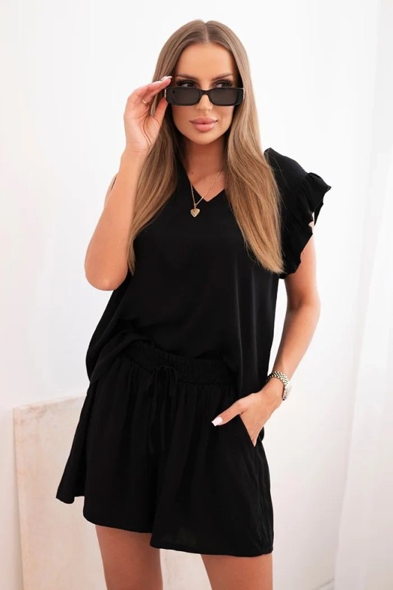 Komplet damski z wiskozy bluzka z falbankami i krótkie szorty czarny
