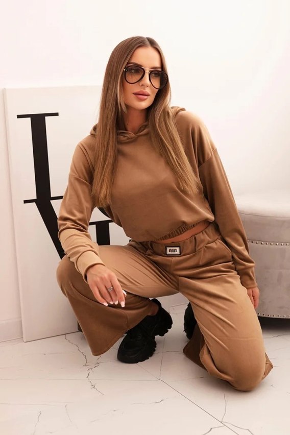 Komplet dresowy damska z weluru z szerokimi nogawkami i bluzą z kapturem camelowy