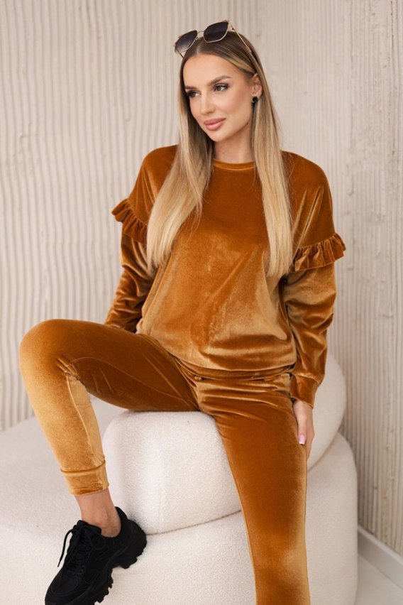 Prezentujemy Państwu komplet bluzy i spodni. Komplet wykonany z weluru. Bluza z falbankami. Spodnie z kieszeniami oraz wiązanie w pasie. Bardzo modny i stylowy komplet. Komplet wykonany jest z wysokiej jakości materiału. Rozmiar jest uniwersalny i będzie odpowiedni dla Pań w rozmiarze S, M lub L.