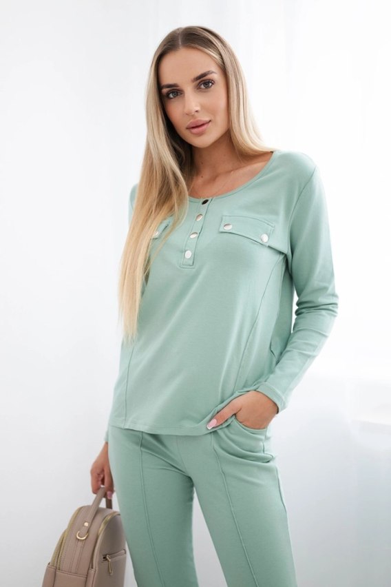 Prezentujemy Państwu komplet bluzki i spodni. Bluzka posiada zapięcie w dekolcie na napy. Spodnie z kieszeniami i wiązaniem w pasie. Komplet wykonany jest z wysokiej jakości materiału. Rozmiar jest uniwersalny i będzie odpowiedni dla Pań w rozmiarze S, M lub L.