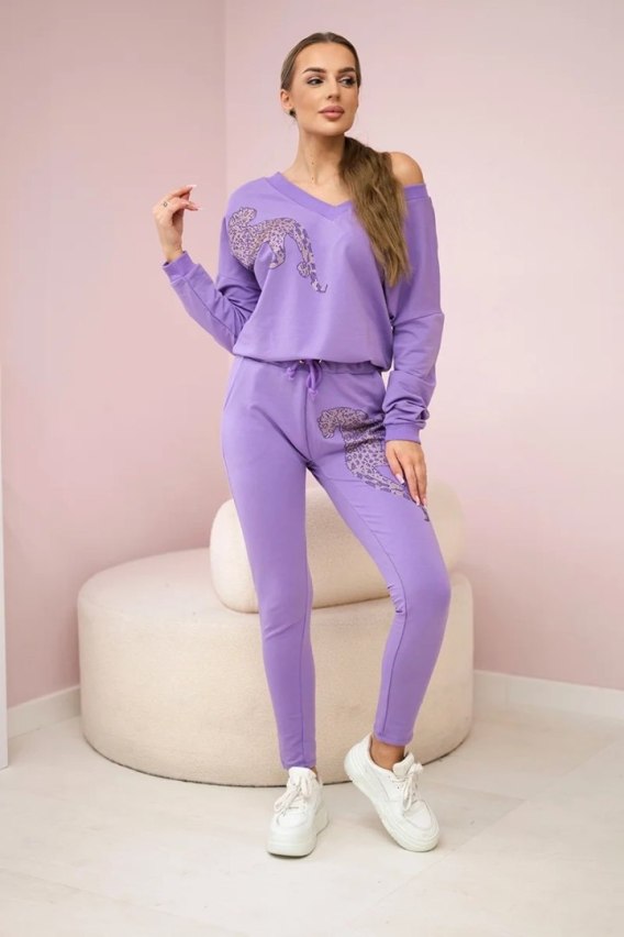 Prezentujemy Państwu komplet bluzy i spodni. Bluza oraz spodnie posiadają panterę z cyrkonii. Spodnie z kieszeniami i wiązaniem w pasie. Bluza z dekoltem V. Komplet wykonany jest z wysokiej jakości materiału. Rozmiar jest uniwersalny i będzie odpowiedni dla Pań w rozmiarze S, M lub L.