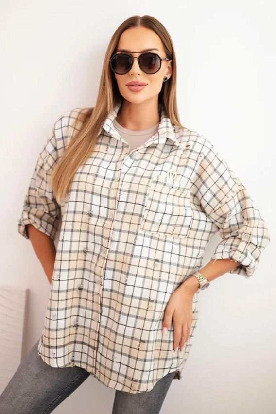 Koszula damska bawełniana w kratę z efektem przetarć beżowa