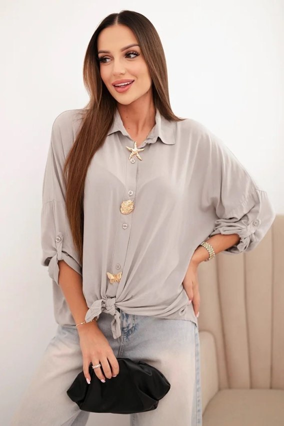 Koszula damska z wiskozą z ozdobnymi guzikami i kołnierzem ciemno beżowa