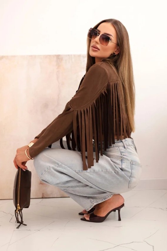 Kurtka damska z frędzlami to wyjątkowy model, który przyciąga spojrzenia i dodaje stylizacji charakteru. Wykonana z miękkiego materiału przypominającego zamsz, idealnie wpisuje się w najnowsze trendy boho i western. Krótki krój pięknie podkreśla sylwetkę, a efektowne frędzle wzdłuż rękawów i frontu nadają jej swobodnego, stylowego wyglądu. Świetnie sprawdzi się zarówno na co dzień, jak i podczas festiwali czy spotkań w plenerze. Ten model to doskonały wybór dla kobiet ceniących sobie unikalny styl i wygodę. Możesz nosić ją zarówno do jeansów, jak i do sukienek, tworząc oryginalne i modne stylizacje. Rozmiar jest uniwersalny i będzie odpowiedni dla Pań w rozmiarze S, M lub L.