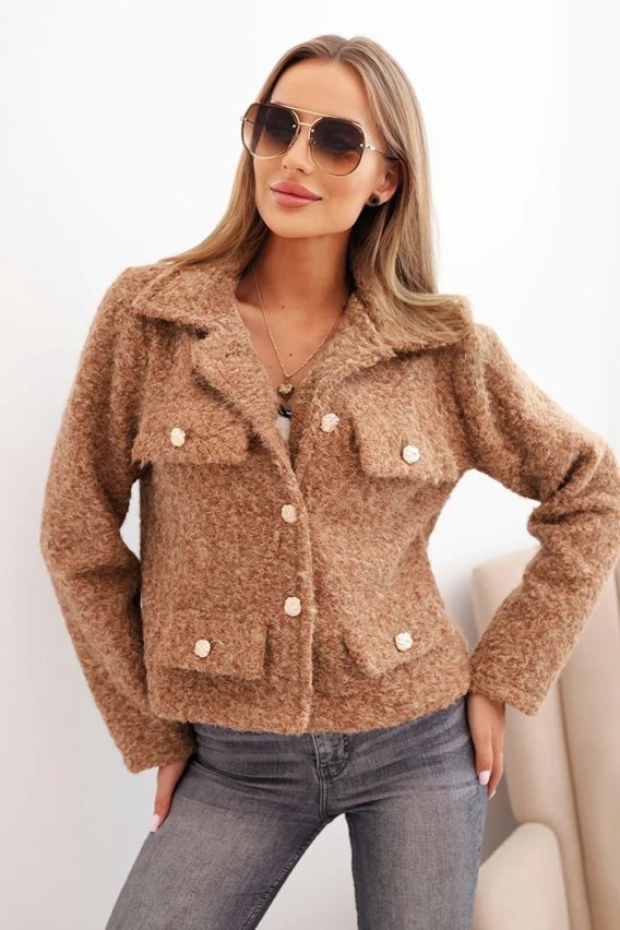 Kurtka damska z wełną o puszystej strukturze i ozdobnymi guzikami camelowa