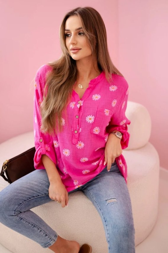 Lniana damska bluzka w kwiaty z długim rękawem i guzikami różowa