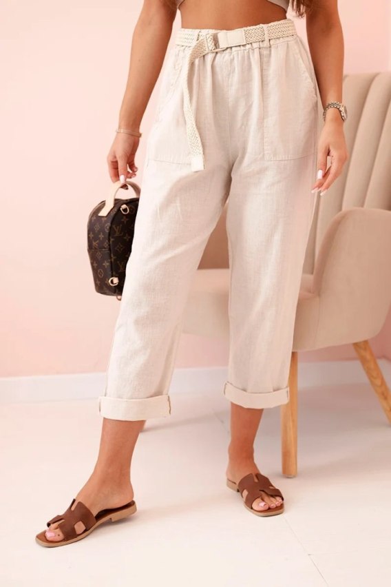 Spodnie damskie lniane z bawełną i paskiem beżowe