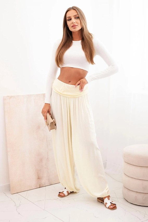 • Spodnie damskie wiskozowe z szeroką nogawką i marszczeniami żółte
