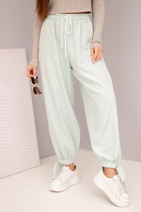 Spodnie damskie z szeroką nogawką i wiązaniem u dołu ciemno miętowe