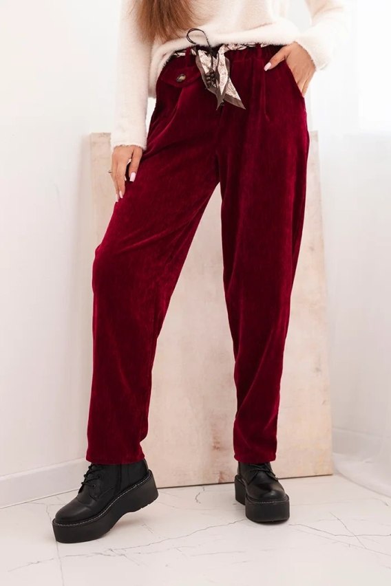 Spodnie damskie z wiskozy z apaszkowym paskiem bordowe