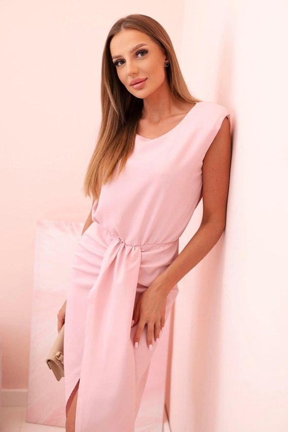 Sukienka damska elegancka z gumką w talii i rozcięciem jasno różowa