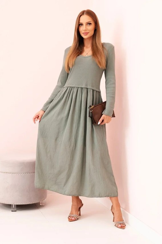 Zwiewna sukienka damska uszyta z przyjemnej w dotyku bawełnianej dzianiny, która pięknie układa się na sylwetce. Góra z prążkowanego materiału podkreśla kobiecą linię, natomiast dół z lekko marszczonym wykończeniem dodaje lekkości. Głęboki dekolt V optycznie wysmukla szyję, a długi rękaw zapewnia komfort w chłodniejsze dni.