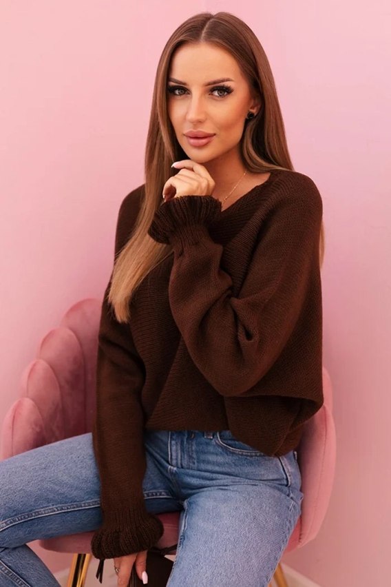 Sweter damska z moheru z marszczonymi rękawami i wycięciem na plecach brązowy